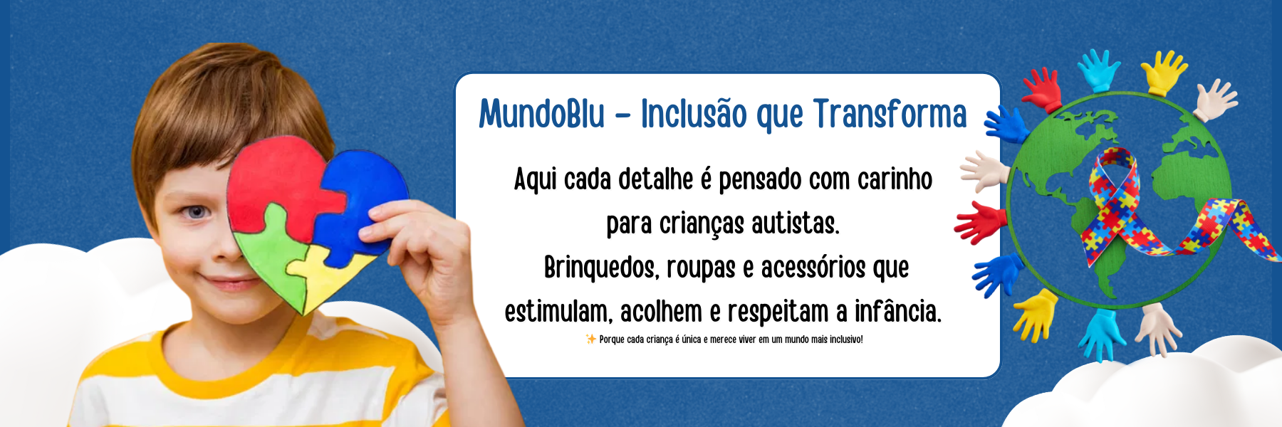 Na MundoBlu, cada detalhe importa: desde a escolha dos brinquedos educativos, roupas confortáveis e acessórios encantadores, até a forma carinhosa de atender cada família. A missão é clara: “Cuidar de cada detalhe para um mundo mais inclusivo”.